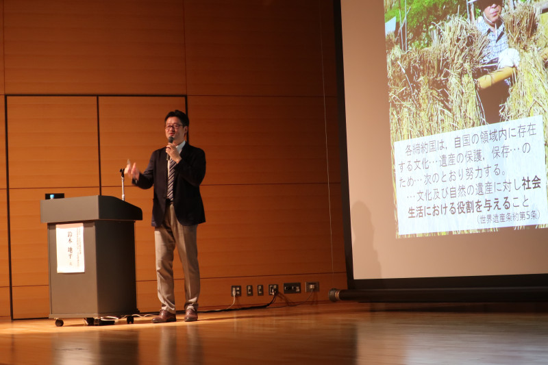 文化庁文化財調査官の鈴木地平さんを講師にお招きし、世界遺産登録を目指す「飛鳥・藤原の宮都」の歴史的背景や価値について、世界遺産の制度や登録の仕組みなどにも触れながらお話しいただきました。